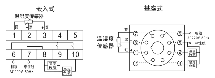 2)基座式安装:将凝露控制器插入8芯标准继电器座,然后置于导轨或直接固定在安装面板上即可。